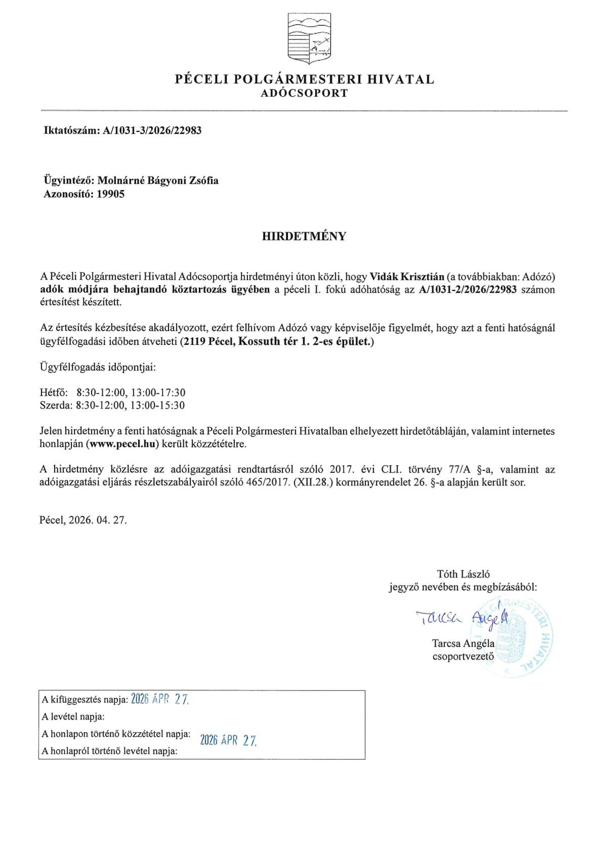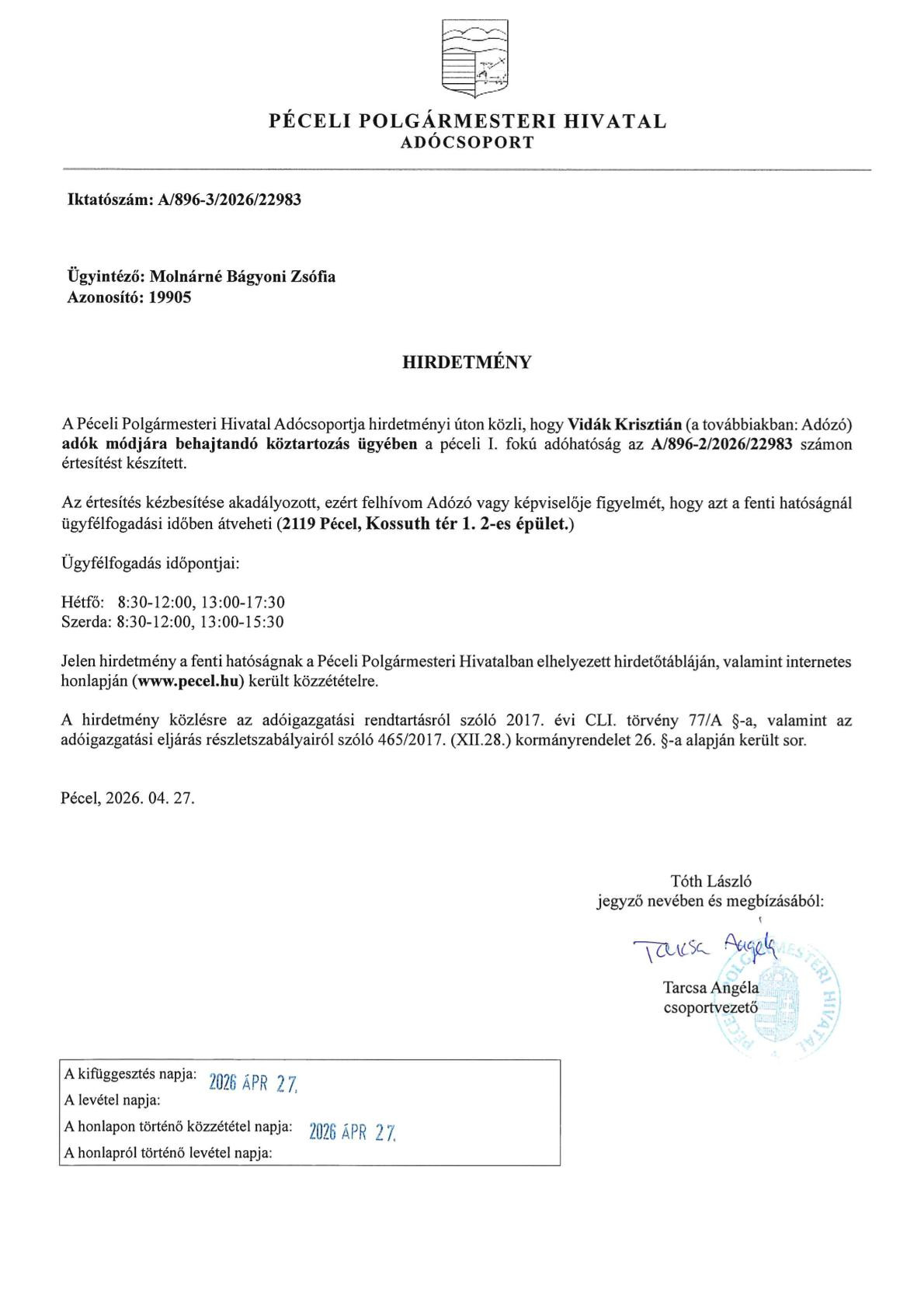 Kezdőlap Hírek Hirdetmények Hirdetmény - Vidák Krisztián 2026 április 28. Hirdetmény - Vidák Krisztián