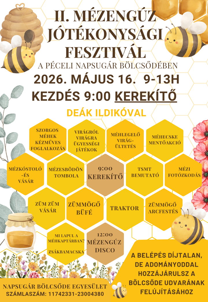 Kezdőlap Hírek Közösség Jótékonysági fesztivál a Napsugár bölcsődében 2026 április 27. Jótékonysági fesztivál a Napsugár bölcsődében Május 16-án jótékonysági fesztivált tartanak a Napsugár bölcsődében. A bevételt az udvar felújítására fordítják majd.
