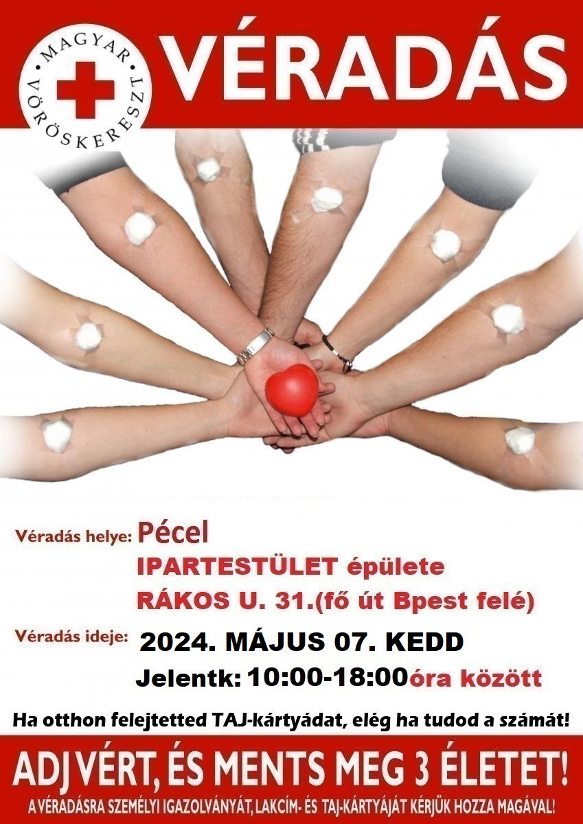 Kezdőlap Hírek Közösség Véradás - 2024. május 7. (kedd) 10 órától 18 óráig - Péceli Ipartestület székháza (Rákos utca 31.) 2024 április 30. Véradás - 2024. május 7. (kedd) 10 órától 18 óráig - Péceli Ipartestület székháza (Rákos utca 31.)