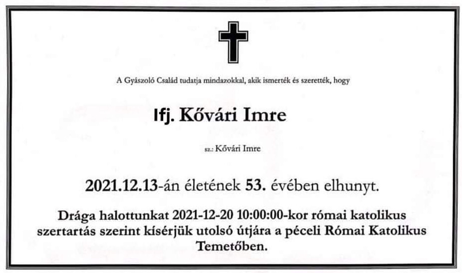 Kezdőlap Hírek Önkormányzat Búcsúzunk 2021 december 17. Búcsúzunk Fájó szívvel búcsúzunk Ifj. Kővári Imrétől városunk köztiszteletben álló önkormányzati képviselőjétőlUtolsó útjára, végső nyugvóhelyére kísérjük december 20-án 10 órakor a péceli Római Katolikus Temetőben.