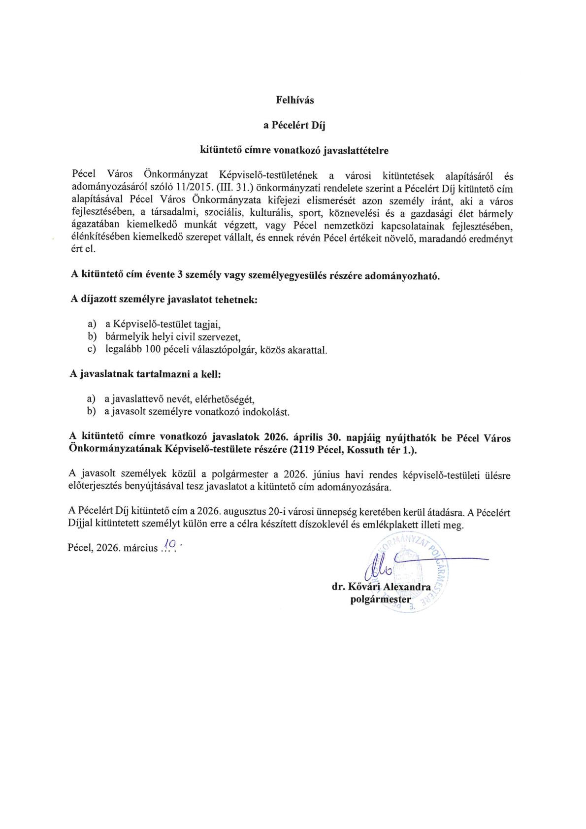 Kezdőlap Hírek Önkormányzat Felhívás Pécelért kitüntető címre vonatkozó javaslattételre 2026 március 10. Felhívás Pécelért kitüntető címre vonatkozó javaslattételre