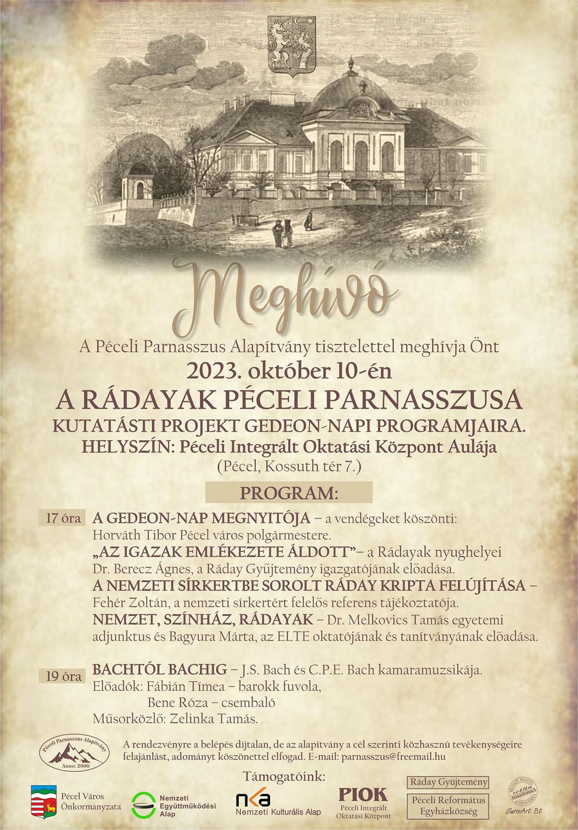 Kezdőlap Hírek Kultúra GEDEON-NAPI PROGRAMOK 2023 2023 szeptember 26. GEDEON-NAPI PROGRAMOK 2023 A Péceli Parnasszus Alapítvány szeretettel meghív minden kedves érdeklődőt a RÁDAYAK PÉCELI PARNASSZUSA KUTATÁSI PROJEKT 2023. évi GEDEON-NAPI programjaira.Időpont: 2023. október 10-én 17 óraHelyszín: Péceli Integrált Oktatási Központ Aulája