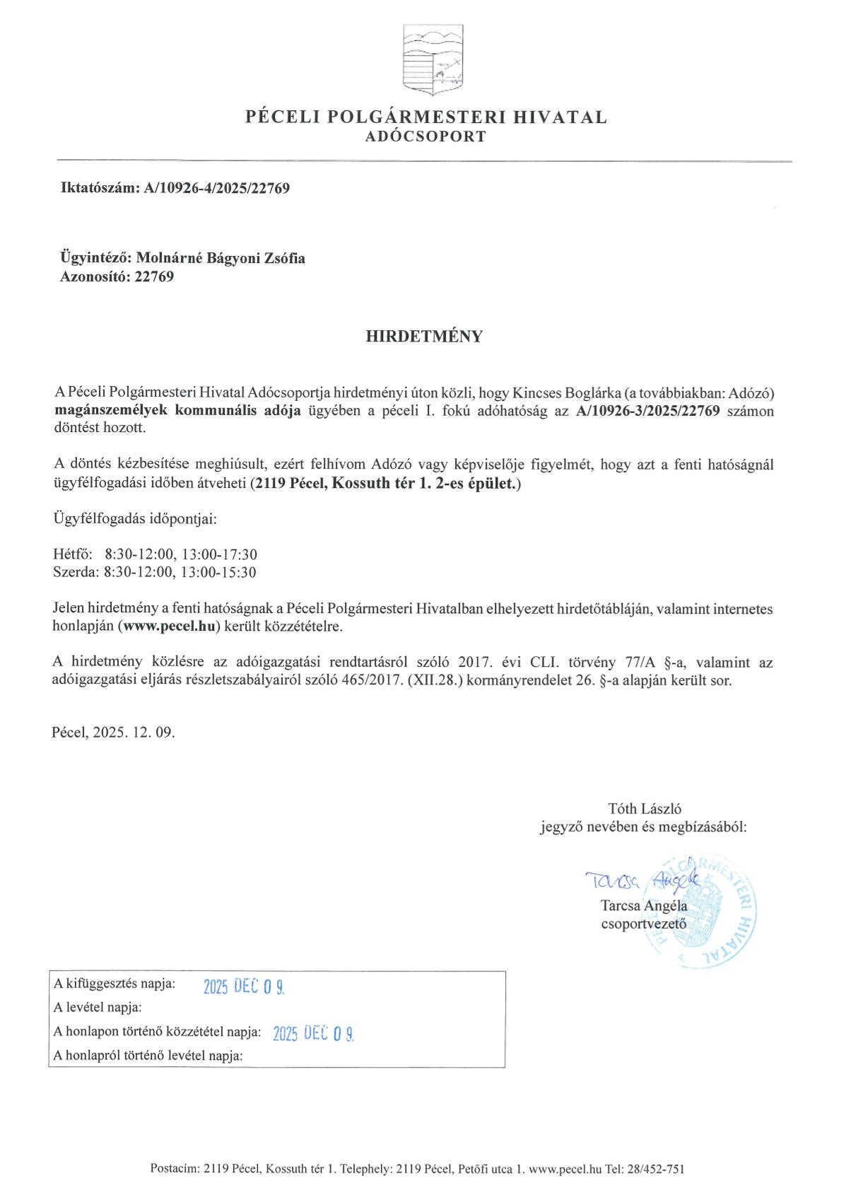 Kezdőlap Hírek Hirdetmények Hirdetmény - Kincses Boglárka 2025 december 09. Hirdetmény - Kincses Boglárka
