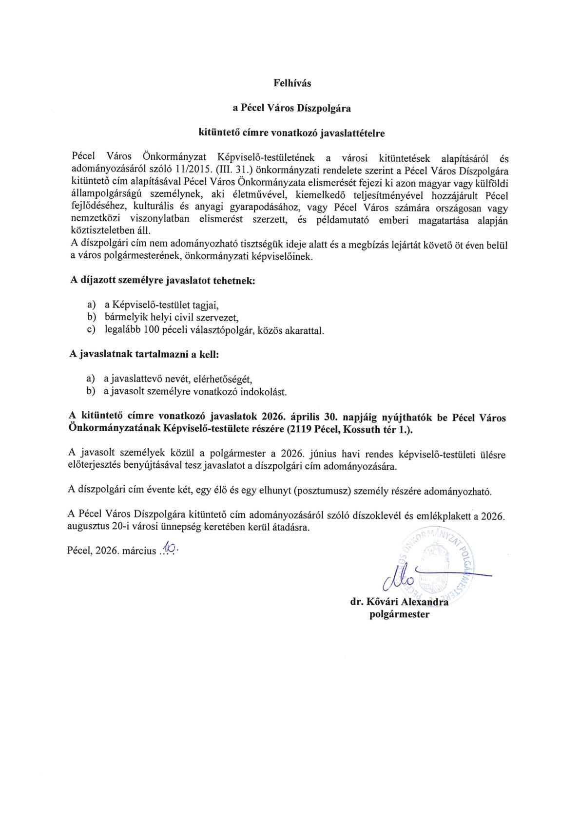 Kezdőlap Hírek Önkormányzat Felhívás Pécel Város Díszpolgára kitüntető címre vonatkozó javaslattételre 2026 március 10. Felhívás Pécel Város Díszpolgára kitüntető címre vonatkozó javaslattételre