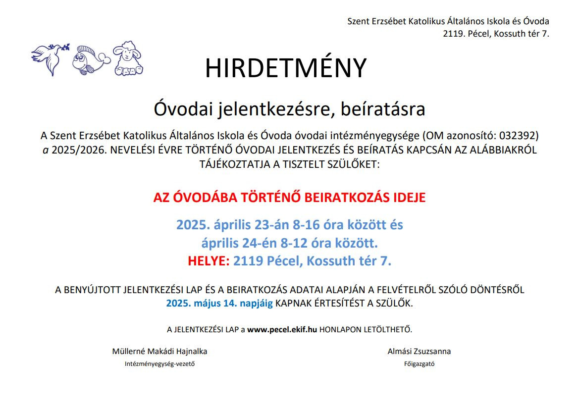 Kezdőlap Hírek Hirdetmények Óvodai jelentkezés és beíratás - Szent Erzsébet Katolikus Általános Iskola és Óvoda 2025 április 07. Óvodai jelentkezés és beíratás - Szent Erzsébet Katolikus Általános Iskola és Óvoda