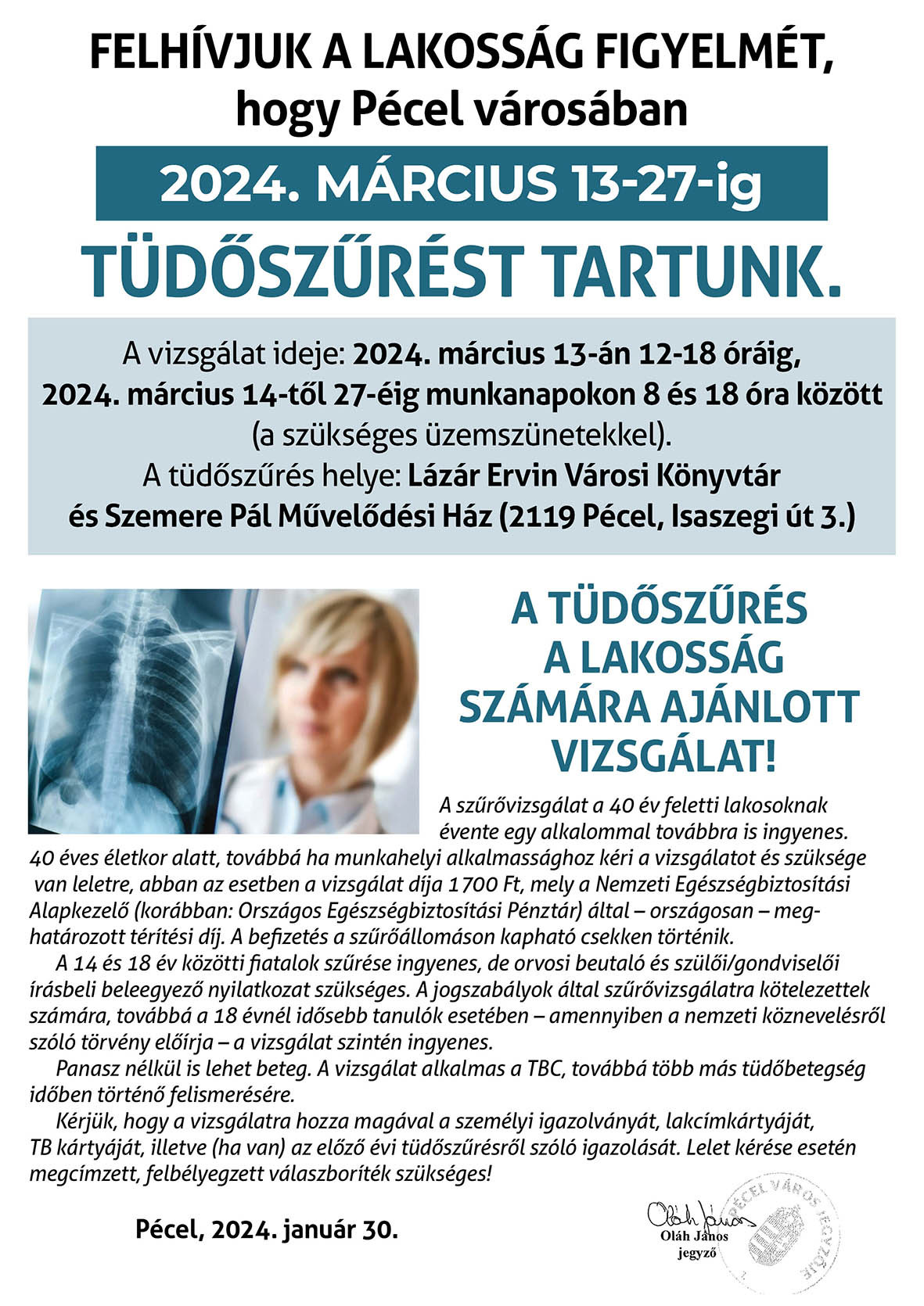 Kezdőlap Hírek Egészségügy TÜDŐSZŰRÉS - 2024. március 13-27-ig 2024 február 01. TÜDŐSZŰRÉS - 2024. március 13-27-ig 2024. március 13-27-ig