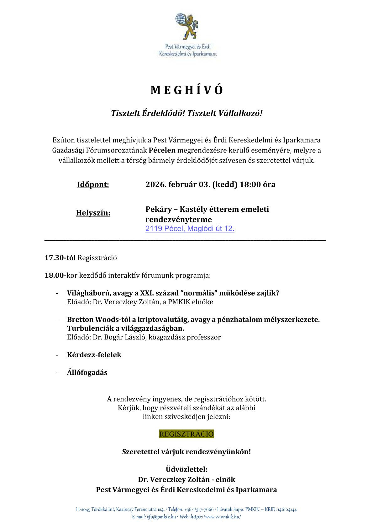 Február 3-án a Pest Vármegyei és Érdi Kereskedelmi és Iparkamra szervezésében kerül sor gazdasági fórumra a Pekáry Kastélyétterem emeleti terében.