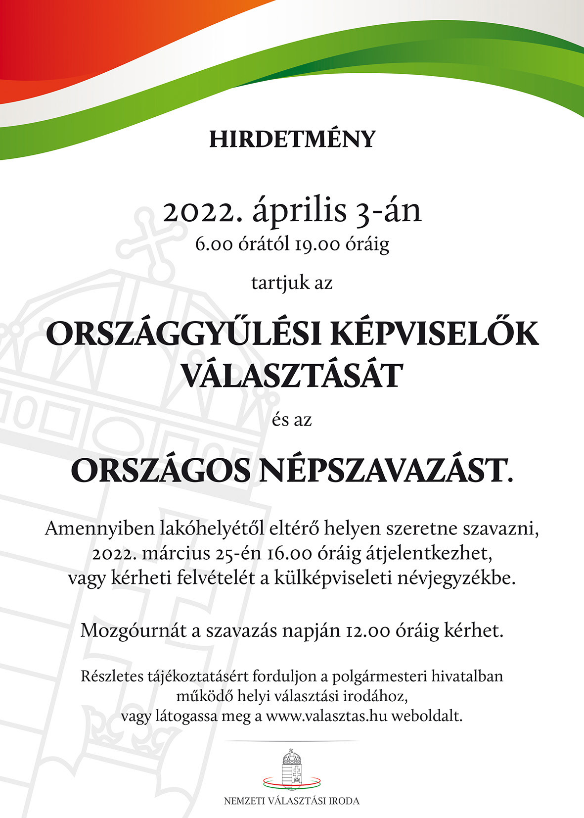 Kezdőlap Hírek Önkormányzat Országgyűlési választás és országos népszavazás 2022 január 25. Országgyűlési választás és országos népszavazás 2022. április 3.