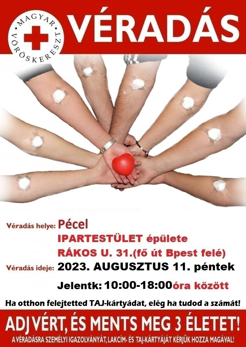 Kezdőlap Hírek Közösség Véradás - 2023. augusztus 11. (péntek) 10 órától 18 óráig - Péceli Ipartestület székháza (Rákos utca 31.) 2023 augusztus 04. Véradás - 2023. augusztus 11. (péntek) 10 órától 18 óráig - Péceli Ipartestület székháza (Rákos utca 31.)